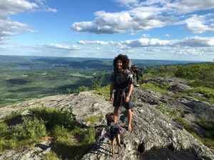 A joyful picture of the author, Raei Bridges, and pup on a hike.
