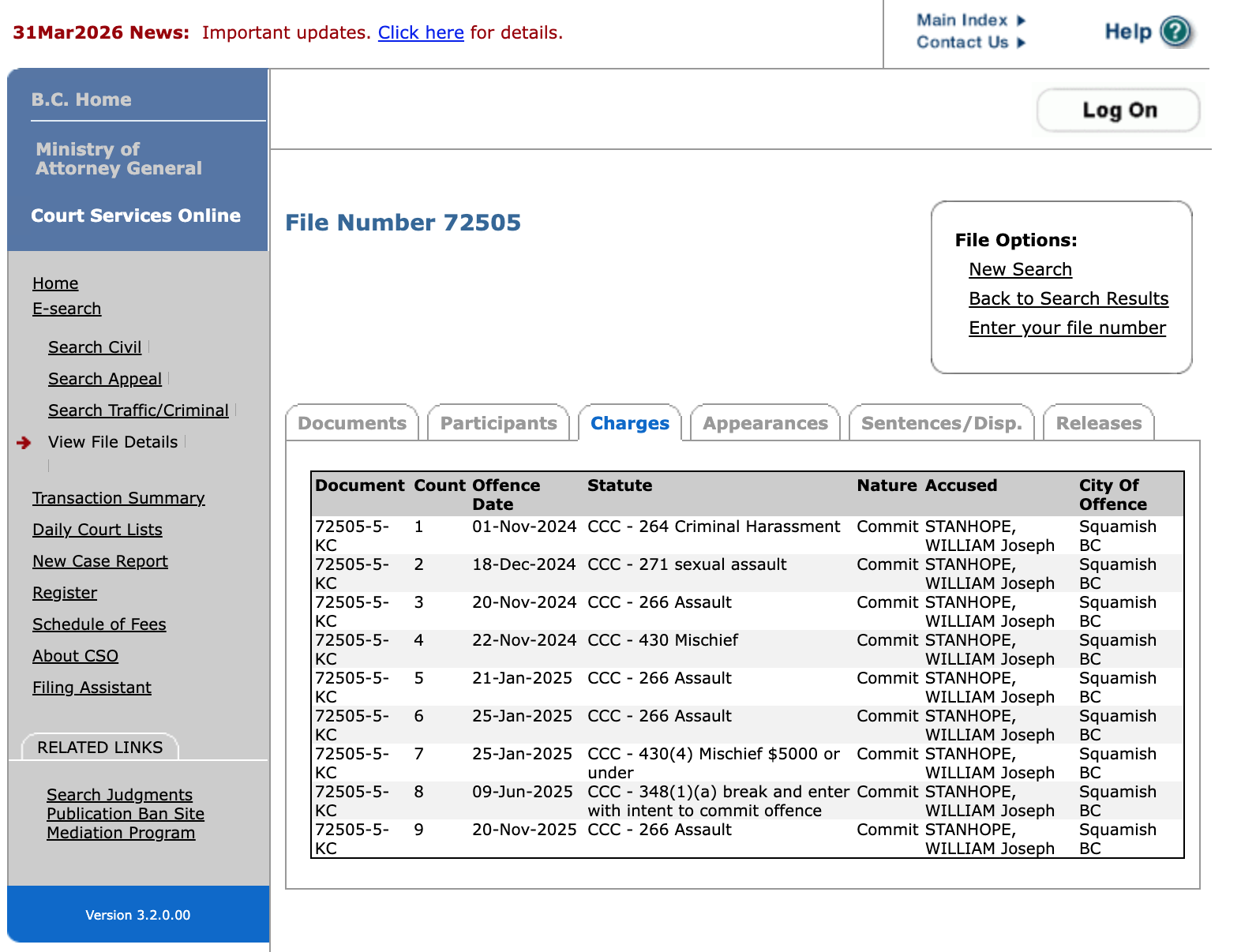 Stanhope didn’t just climb rocks, he also climbed the rape culture pyramid all the way to the top being charged by the government of British Columbia with sexual assault. You can search his first and last name here in the Government of British Columbia’s database. Below is a screenshot from the database of his charges. The charges include: criminal harassment, Mischief, and assault in November 2024, sexual assault in December 2024, and several other asault charges throughout 2025.